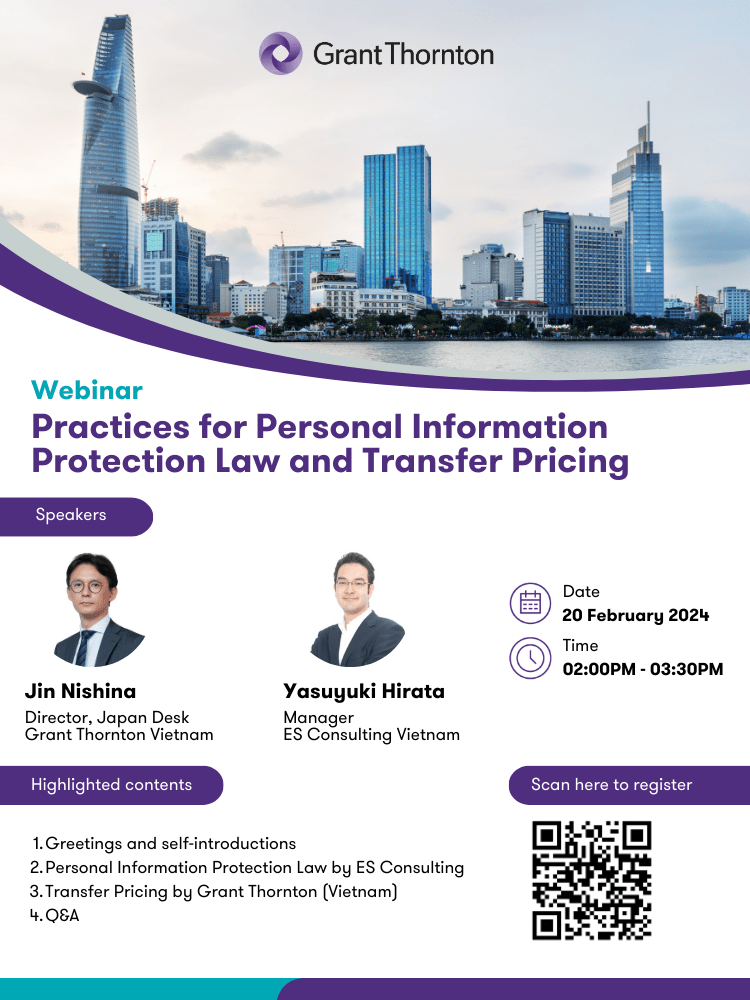 Grant Thornton Vietnam would like to invite you to join the webinar co-hosted with ES Consulting Vietnam, on the topic "Best Practices for Personal Information Protection Law and Transfer Pricing" with the following information: