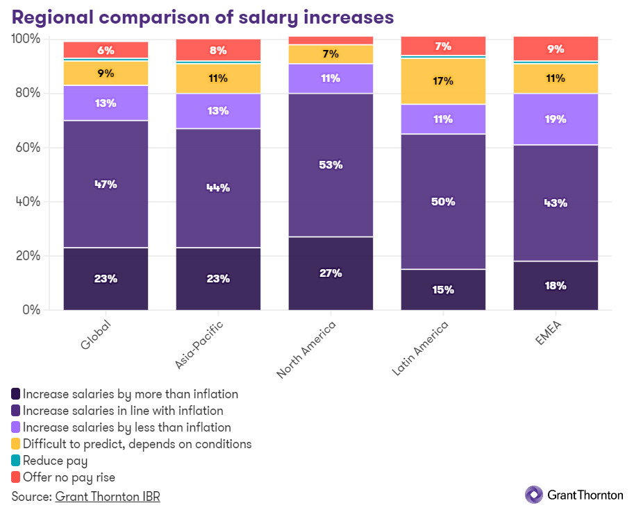 Despite significant inflationary pressures, most mid-market firms intend to ensure the wages they pay keep up. Globally, seven in ten firms are planning to give pay rises in line with or above inflation. Employees in North America are most likely to get a real terms wage increase, with 27% of firms offering real increases. Similarly, in the UK, the most recent data shows that average pay growth has exceeded inflation for the first time in almost two years.[4]