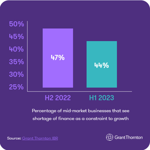 In ‘Smart investment’ we highlighted that at the end of 2022 poor access to cash was a real concern for businesses trying to fund investment. However, as 2023 has progressed, we have seen mid-market leaders become more confident that they can overcome shortage of finance. The percentage of respondents who regard this as a constraint to business growth dropped from 47% to 44%, the lowest it has been since the second half of 2019, before the pandemic.