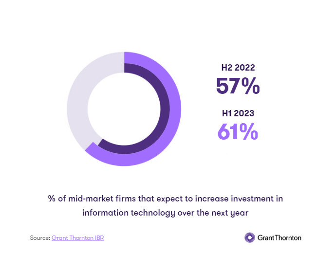 Globally, more than half of firms we surveyed expect to increase investment across technology, research and development (R&D) and staff. The growth in investment echoes, and is likely a result of, the rise in optimism among mid-market firms. Technology is the area most firms plan to invest in, with 61% of mid-market firms expecting this to happen over the next 12 months, up from 57% in the second half of 2022.
