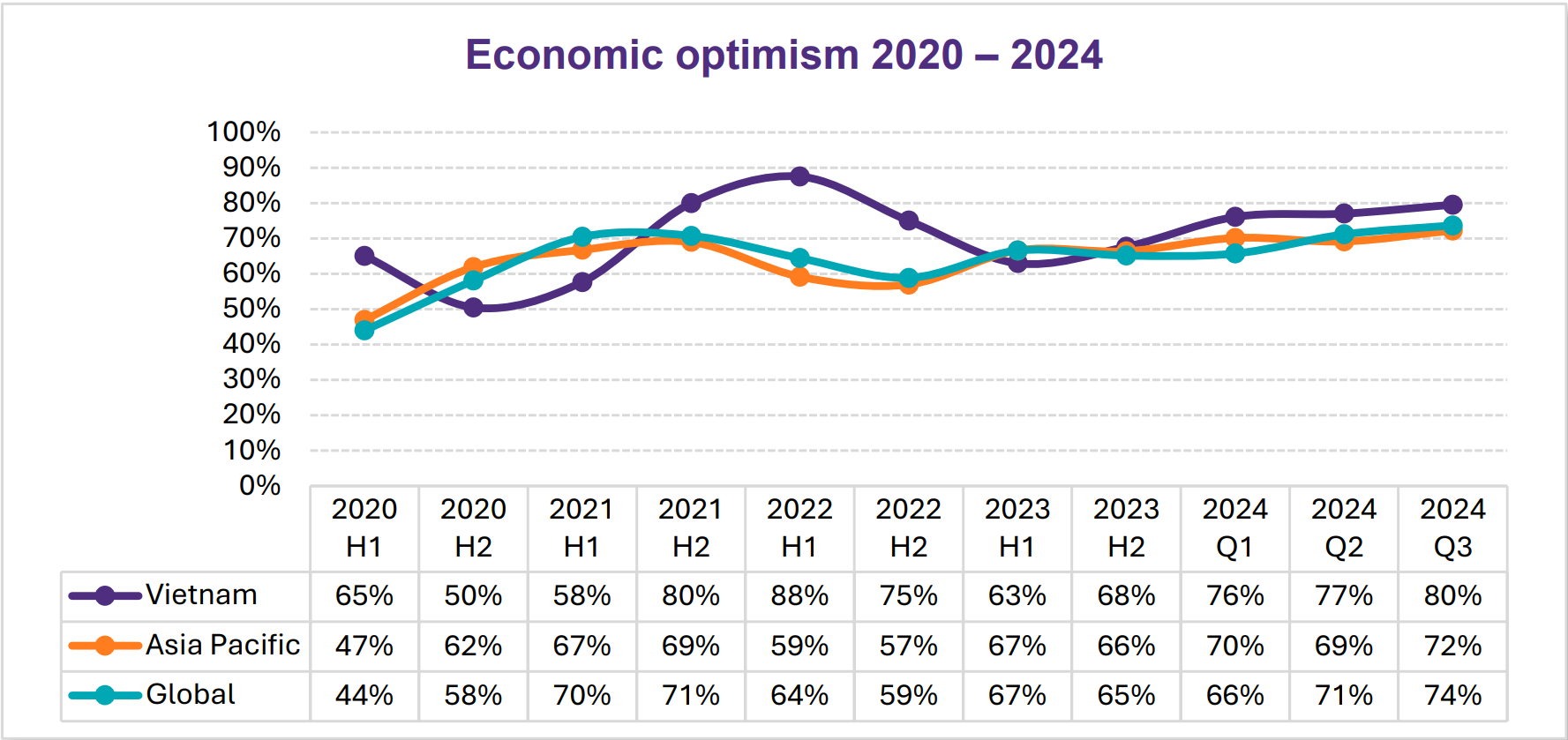 In terms of optimism Vietnam was above the global average by 3 points at 80% registering an increase of 3%points, whilst ASEAN showed a drop of 1 point to 73%.
