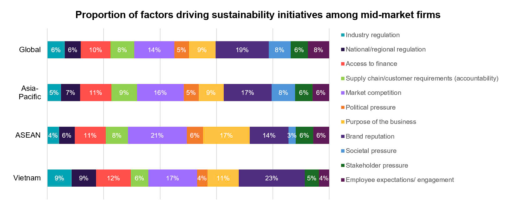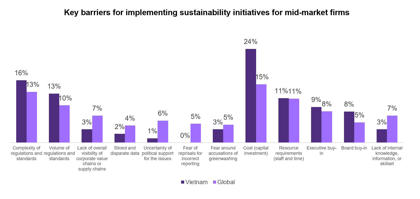 For Vietnamese businesses, the journey toward sustainability faces similar but more pronounced challenges. “Cost” is the most significant barrier, with 24% of mid-market firms citing it, compared to 15% globally, indicating the significant financial strain of implementing ESG initiatives in Vietnam. “Complexity of regulations and standards” is another major challenge, selected by 16% of firms in Vietnam compared to 13% globally.