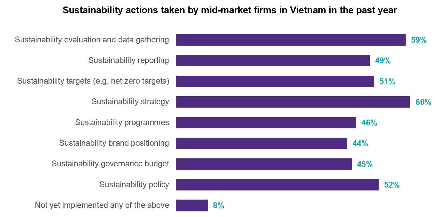 Additionally, it was revealed that mid-market firms are particularly focused on enhancing their brand reputation by taking visible and engaging actions for customers and stakeholders rather than formal reporting on their sustainability progress and relevant metrics. According to the survey findings, mid-market firms globally are concentrating their sustainability efforts primarily on developing and implementing sustainability strategies (51%), followed by gathering relevant data (47%). Sustainability reporting comes in third (40%), indicating it is not the top priority. In Vietnam, the top priorities are developing and implementing a sustainability strategy (60%) and conducting sustainability evaluation and data gathering (59%). In contrast, reporting ranks fifth, with 49%.