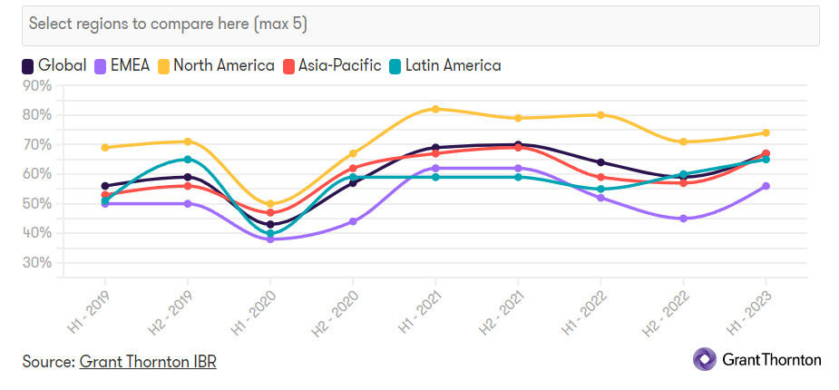 The biggest increase in optimism has been among mid-market firms in EMEA, where optimism has jumped by 11%. Energy prices are down and inflation is easing, which gives reason to believe euro area economies have adjusted to the economic shock[1]. Now, more than half (56%) of business leaders in the region are optimistic, up from 45% last year. In Asia-Pacific the proportion of leaders who are optimistic about their businesses has risen from 57% to 67%, and in Latin America the figure has gone up from 60% to 65%. Mid-market firms in North America remain the most optimistic, increasing from 71% to 74% in the first half of 2023.