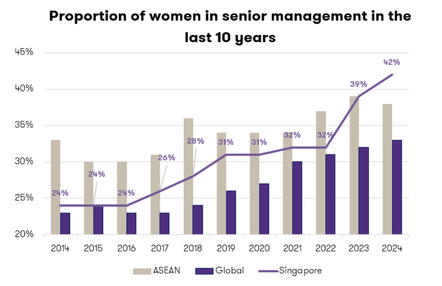 In this year's report, the overall proportion of women in senior leadership in Singapore's mid-market businesses has inched up slowly to 42%. Across ASEAN, we observed a marginal dip in the proportion of women in senior management to 38% in 2024.