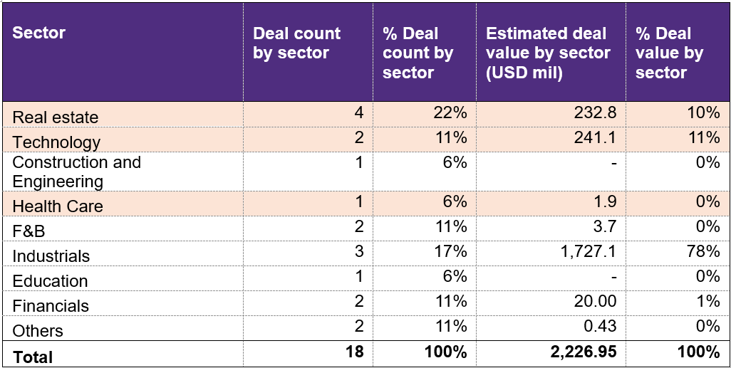 - Real estate, Technology, Industrial Manufacturing, and Financial Services remained the leading sectors both in terms of deal count and transaction value.