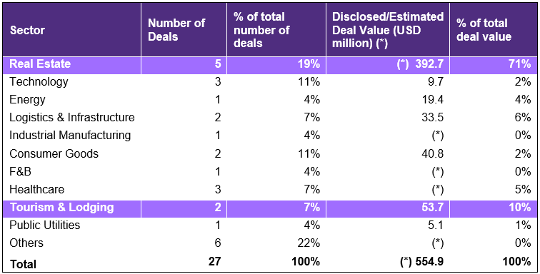 Real estate continued to be the leading sector for M&A activity with 5 recorded deals, and the total value of the 3 transactions with disclosed information reached approximately USD 392.7 million. Transactions in the sector primarily revolved around restructuring activities and the transfer of component projects.