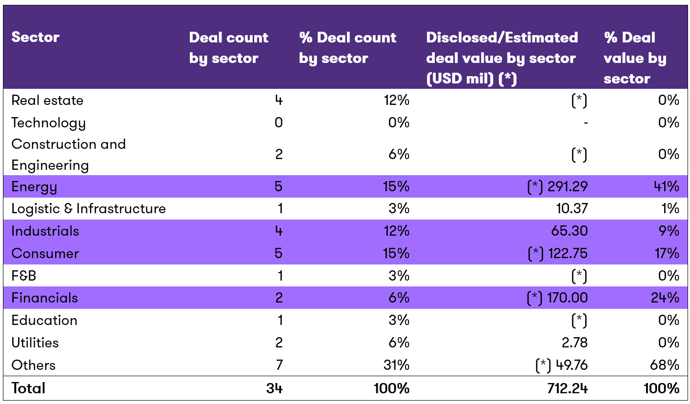Regarding deal volume, sector diversity continued to be maintained, with Energy and Consumer accounting for the largest number of deals, with five deals each sector.