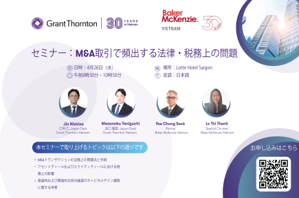 Grant Thornton Vietnamは、Baker McKenzie Vietnamと共同で、税務・法務の観点からの知見をご提供するM&Aセミナー「M&A取引で頻出する法律・税務上の問題」を開催いたします。本セミナーで取り上げるトピックは以下の通りです。