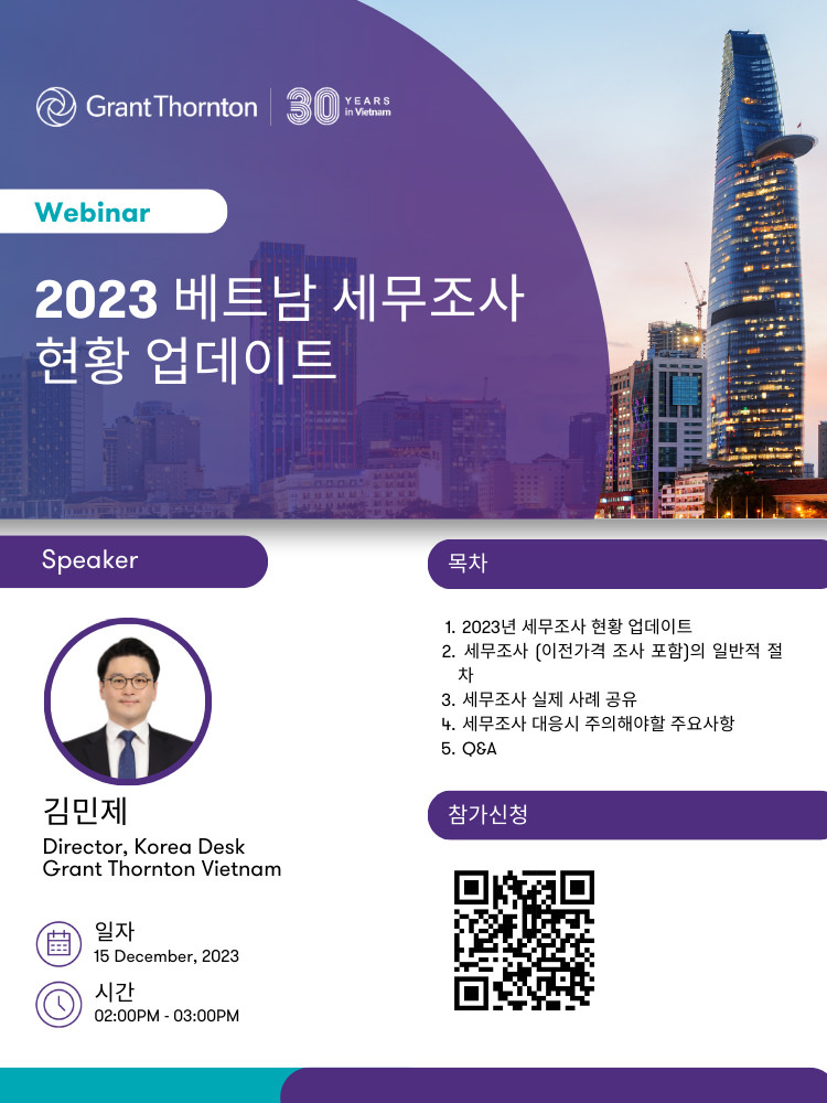 2023년 한해를 정리하며, 저희 회계법인에서는 한 해동안 가장 주목되었던 이슈중에 하나인 “베트남 세무조사”에 관한 웨비나를 준비하였습니다. 특히, 이번 웨비나에서는 세무조사 동향, 주요 세무 및 이전가격 이슈, 세무조사 준비 방법을 집중적으로 공유하여 세무 및 이전가격 리스크를 최소화하고 베트남 세무조사 대응에 대한 회사의 계획 및 전략을 마련하는데 도움이 될 것으로 기대하고 있습니다.