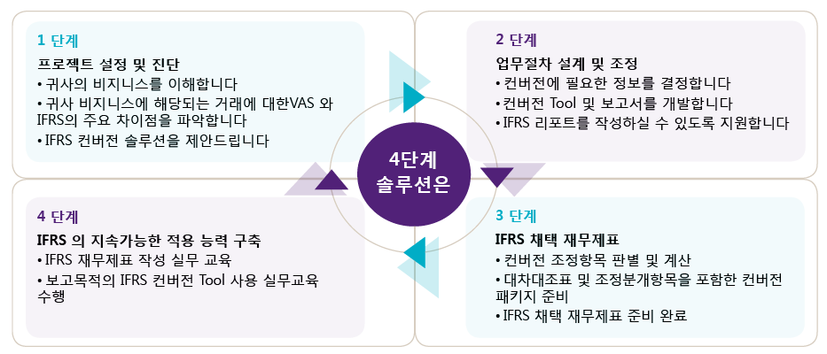 저희 회계법인의 4단계 솔루션은 IFRS 컨버전에 대한 효과적인 접근 방식 및 회사가 지속적으로 IFRS 기준을 준수 할 수있도록 담당자의 규정 및 실무교육을 포함하고 있습니다.
