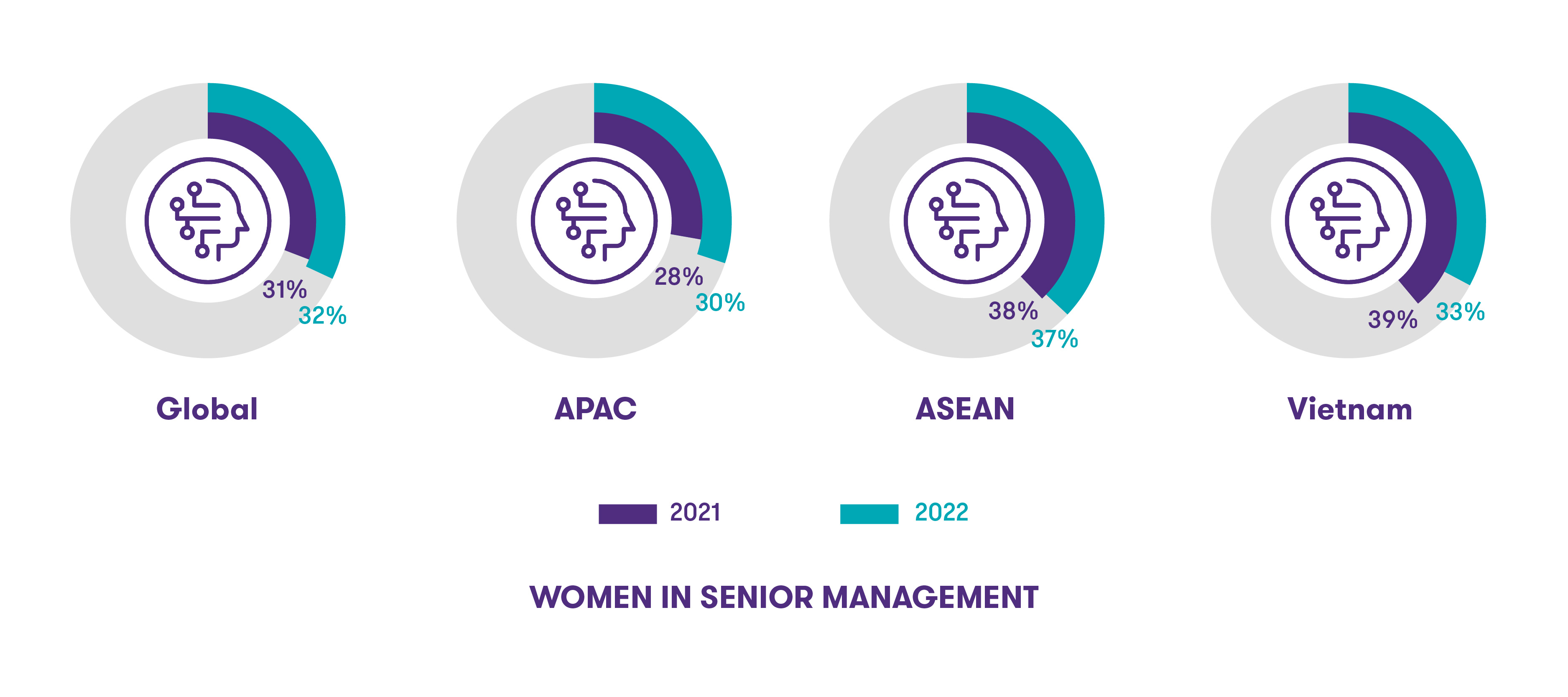 In 2021, our research revealed that the proportion of women in senior management roles had passed the important 30% tipping threshold for the first time. All global regions have now passed the crucial 30% milestone, including APAC, which was the only region not to hit this figure in 2021. Vietnam at 33% is ahead of the curve but sits behind the ASEAN average of 37%.