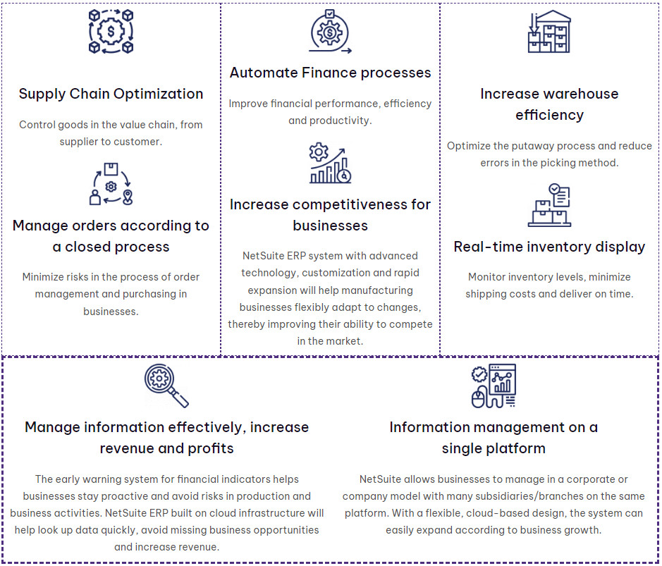 - Manufacturing industry: NetSuite ERP is equipped with specific features suitable for the manufacturing industry and supports flexible customization, faster processing speed, all daily operations are automated, and company-wide data is available. are all linked and consistent with the operating process.