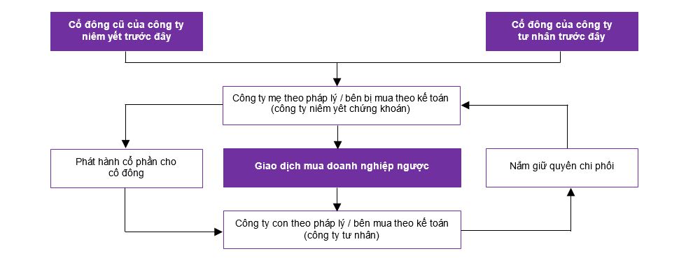 Trong trường hợp này, mặc dù doanh nghiệp niêm yết phát hành cổ phần để mua lại doanh nghiệp tư nhân, tuy nhiên, doanh nghiệp niêm yết sẽ được xác định là bên bị mua và doanh nghiệp tư nhân là bên mua theo kế toán hợp nhất kinh doanh do các cổ đông cũ của doanh nghiệp tư nhân, trên góc độ tập đoàn, có được quyền kiểm soát đối với doanh nghiệp hợp nhất.