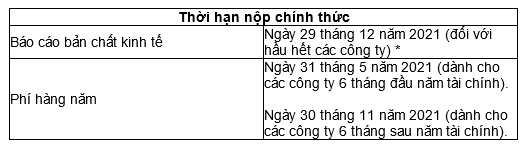 - Thời hạn nộp báo cáo bản chất kinh tế là: không trễ hơn ngày 29 tháng 12 đối với các công ty được thành lập trước năm 2019; còn đối các công ty được thành lập sau năm 2019, thời hạn sẽ là 06 tháng sau ngày kỷ niệm thành lập.