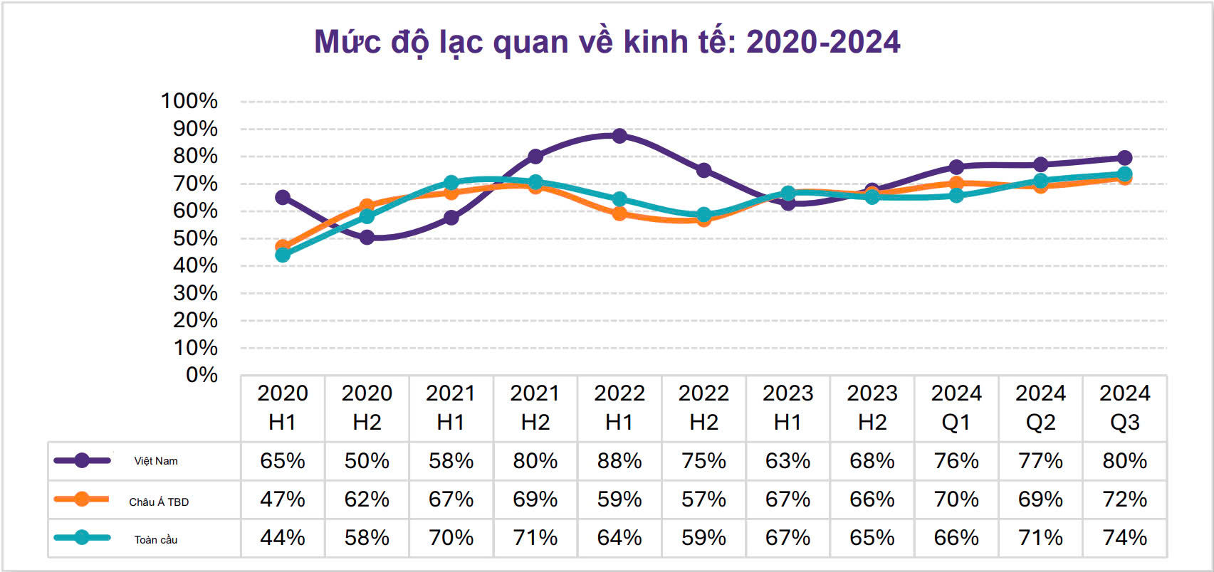 Về mức độ lạc quan, Việt Nam cao hơn mức trung bình toàn cầu 3 điểm ở mức 80% ghi nhận mức tăng 3% trong khi ASEAN giảm 1 điểm xuống còn 73%. Khi được hỏi về những lo ngại về sự bất ổn của nền kinh tế, trên toàn cầu giảm 3 điểm xuống còn 52%, trong khi ASEAN tăng 2 điểm lên 52%, những người trả lời ở Việt Nam ghi nhận sự lo ngại tăng 52% lên 60%. Một mối lo ngại lớn khác