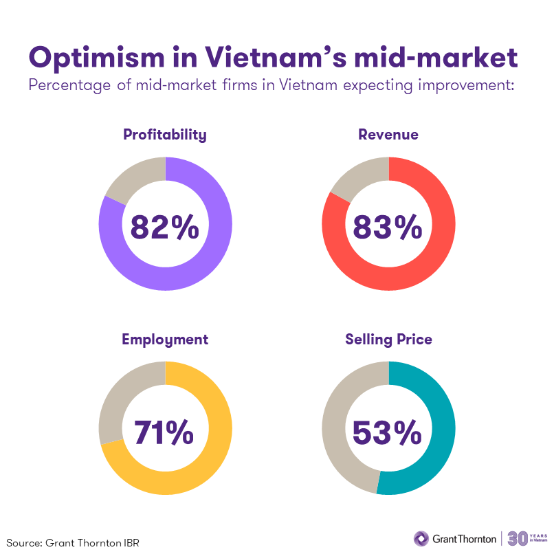 Tại Việt Nam, 82% doanh nghiệp tầm trung kỳ vọng lợi nhuận sẽ tăng lên trong 12 tháng tới. Tương tự, 83% doanh nghiệp, tăng hơn 1% so với nửa cùng kỳ năm trước, được khảo sát dự báo gia tăng doanh thu và 53% doanh nghiệp, tăng hơn 15%, dự đoán giá bán cũng điều chỉnh cao hơn. Vấn đề việc làm, 71% tin rằng sẽ có những thay đổi tích cực trong 12 tháng tới, cao hơn 6% so với lần khảo sát trước. Các số liệu được ghi nhận trong IBR cho thấy các doanh nghiệp đang dần trở nên lạc quan hơn về khả năng phục hồi kinh tế trên toàn cầu với nhu cầu tiêu dùng khôi phục nhiều hơn và các chính sách hỗ trợ kinh tế hiệu quả.
