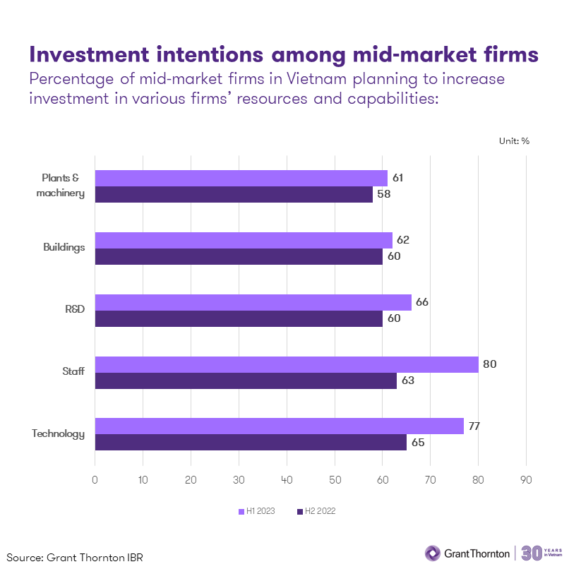 Kết quả khảo sát Báo cáo kinh doanh quốc tế (IBR) mới nhất của Grant Thornton cho thấy tỷ lệ doanh nghiệp quy mô vừa ở Việt Nam muốn tăng cường đầu tư vào các nguồn lực nội bộ của doanh nghiệp, bao gồm công nghệ, nguồn nhân lực, R&D trong 12 tháng tới tăng đáng kể so với nửa cuối năm 2022. Xu hướng tăng này ở Việt Nam cũng tương đồng với kết quả khảo sát toàn cầu, phản ánh nhận thức và mong muốn duy trì khả năng cạnh tranh của các doanh nghiệp bất chấp tình hình kinh tế bất ổn.