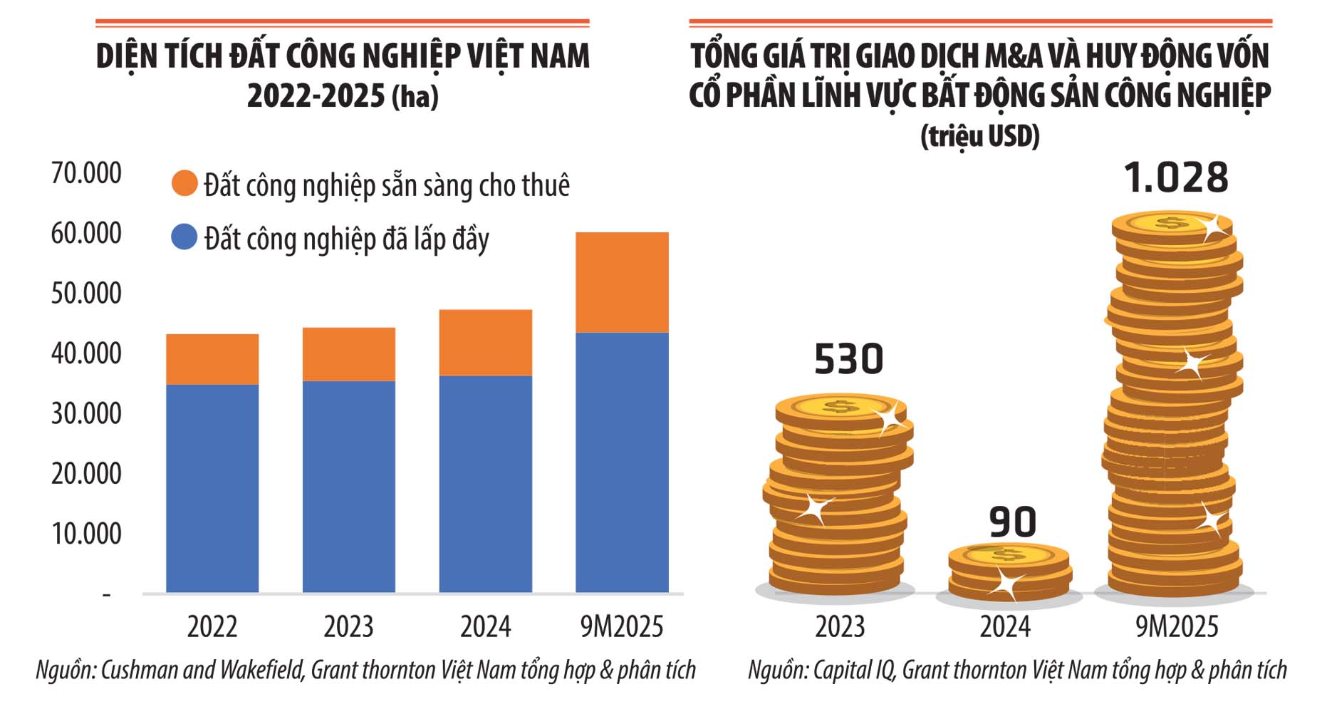 Song hành với sự phát triển này, hoạt động M&A và huy động vốn cổ phần trong lĩnh vực bất động sản công nghiệp cũng đang diễn ra sôi động. Theo số liệu tổng hợp của Grant Thornton, riêng trong 9 tháng đầu năm 2025, thị trường ghi nhận 24 thương vụ M&A và huy động vốn cổ phần (bao gồm cả thương vụ đã hoàn tất và đang công bố) liên quan đến BĐS, với tổng giá trị công bố khoảng 1,8 tỷ USD. Trong đó, bất động sản công nghiệp chiếm tới 55%, tương đương 1 tỷ USD. Đáng chú ý, mức này cao hơn nhiều so với toàn năm 2024, vốn chỉ ghi nhận 7 thương vụ bất động sản khu công nghiệp, tổng giá trị công bố khoảng 90 triệu USD, trong 28 thương vụ BĐS của cả năm.