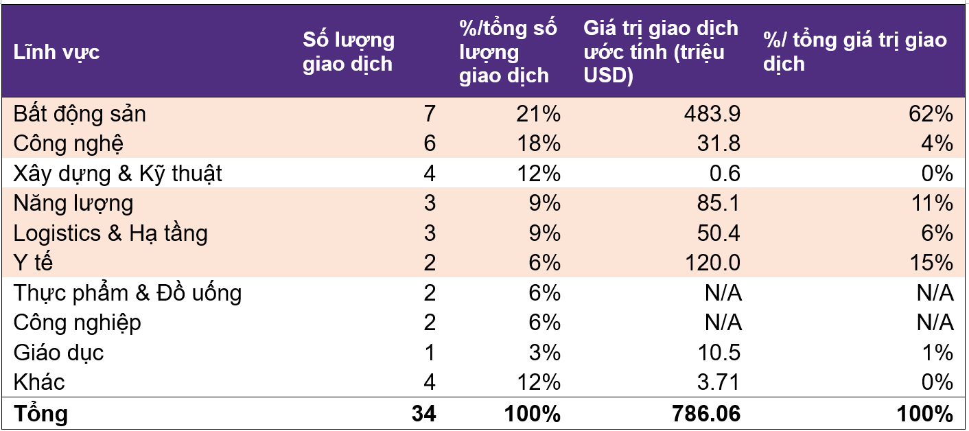 Trong tháng 7, thị trường M&A Việt Nam ghi nhận 34 thương vụ hoàn tất, với tổng giá trị công bố và ước tính đạt khoảng 786 triệu USD. Bất động sản, Công nghệ, Năng lượng, Logistics & Hạ tầng và Y tế là năm lĩnh vực dẫn đầu về số lượng và giá trị giao dịch.