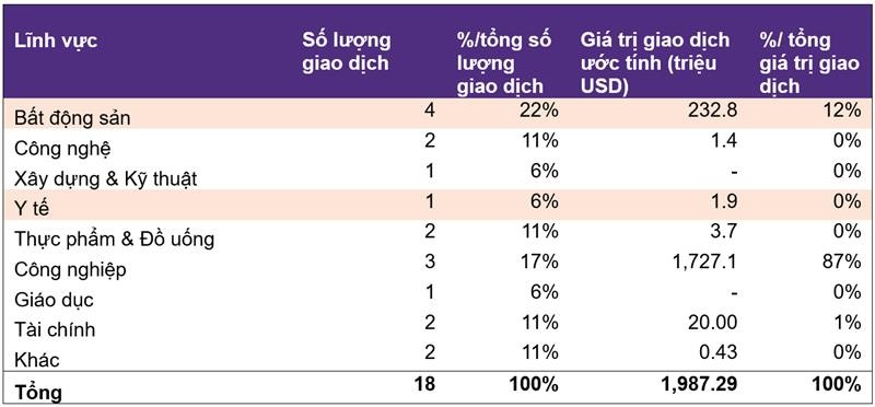 - Bất động sản, Sản xuất công nghiệp và Tài chính tiếp tục là các lĩnh vực dẫn đầu cả về số lượng lẫn quy mô giao dịch.