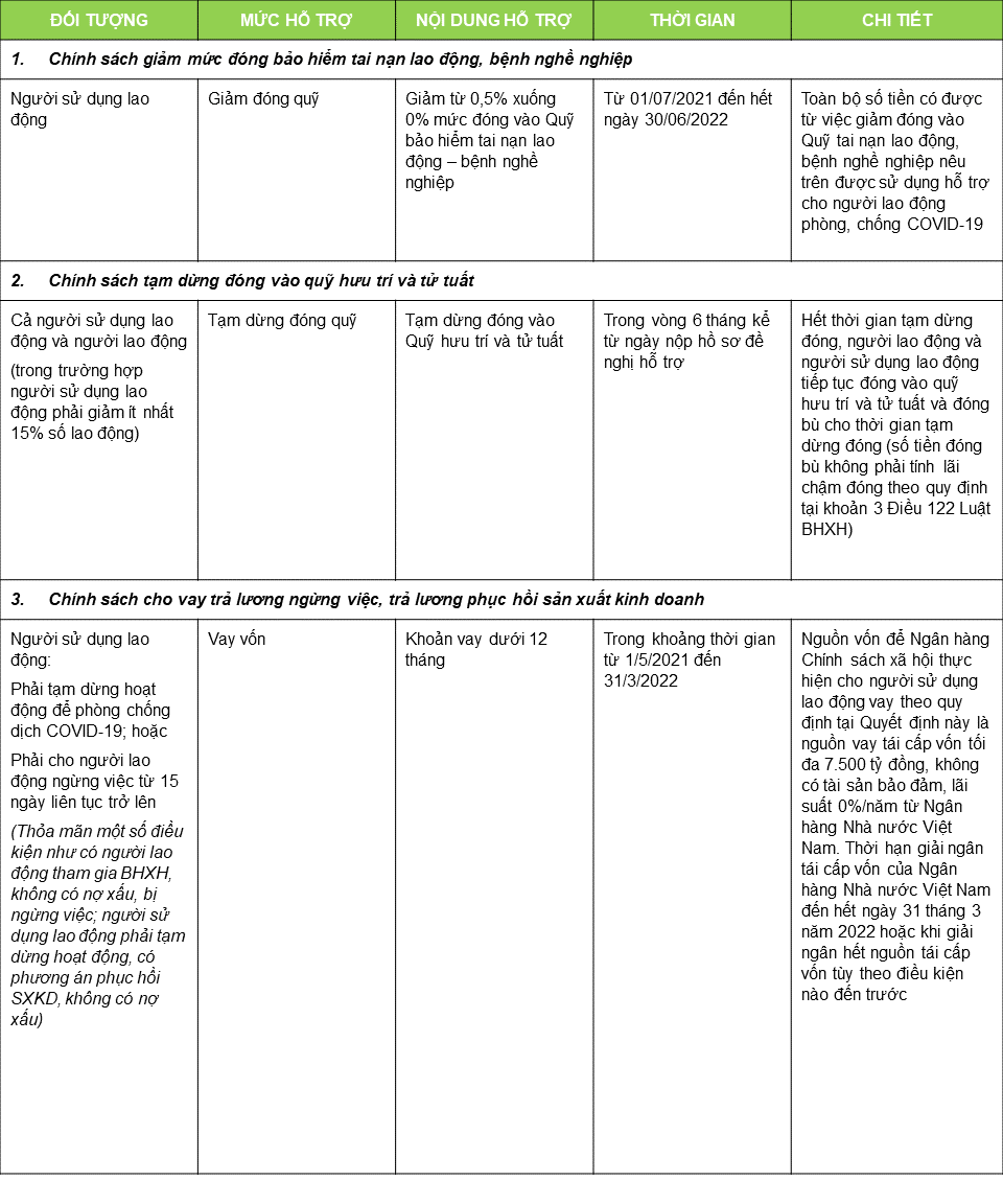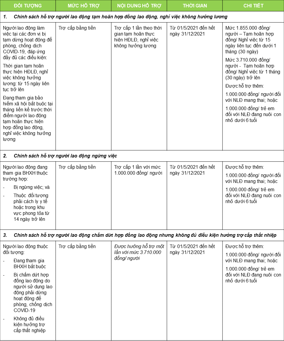 Trước bối cảnh tình hình dịch bệnh COVID-19 diễn ra ngày càng phức tạp dẫn tới tình trạng sản xuất, kinh doanh đình trệ, nhiều doanh nghiệp phải dừng, tạm dừng hoạt động sản xuất kinh doanh, thậm chí phải đóng cửa, kéo theo đời sống của người lao động trên khắp cả nước rơi vào tình trạng bấp bênh, bị ảnh hưởng nghiêm trọng. Để kịp thời ứng phó với tình hình mới, đồng thời đảm bảo an sinh xã hội, Chính phủ đã ban hành Nghị quyết 68/NQ-CP ngày 1/7/2021, Quyết định số 23/2021/QĐ-TTg ngày 07/07/2021 và Công văn 1988/BHXH-TST quy định chi tiết và hướng dẫn các thủ tục áp dụng các chính sách hỗ trợ cho doanh nghiệp và người lao động gặp khó khăn do ảnh hưởng của tình hình dịch bệnh. Theo đó, Grant Thornton Việt Nam xin được cập nhật đến quý doanh nghiệp một số nội dung chính đáng chú ý trong phạm vi chính sách hỗ trợ đã nêu như sau:
