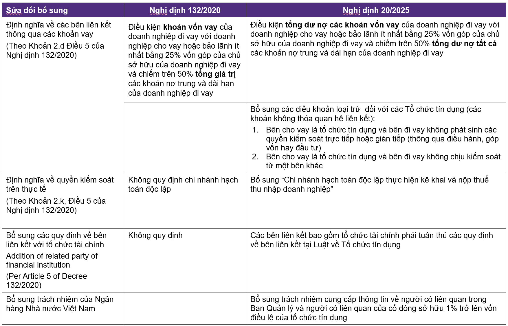 Vào ngày 10 tháng 2 năm 2025, Chính phủ Việt Nam đã ban hành Nghị định số 20/2025/NĐ-CP (Nghị định 20/2025) nhằm sửa đổi bổ sung một số điều được quy định trong Nghị định số 132/2020/NĐ-CP về Quản lý thuế với doanh nghiệp có giao dịch liên kết. Nghị định 20/2025 sẽ có hiệu lực từ ngày 27 tháng 3 năm 2025 và áp dụng cho kỳ tính thuế 2024.