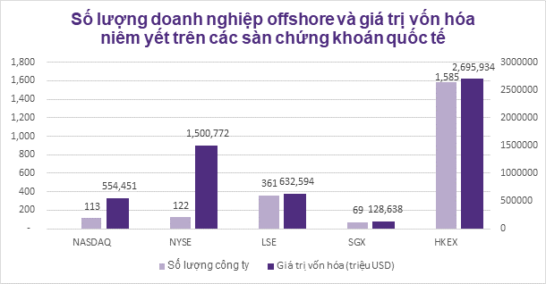 Tại sàn chứng khoán Hồng Kông (HKEX), sàn giao dịch lớn thứ 4 trên thế giới, có trên 1.500 doanh nghiệp offshore đăng ký niêm yết, đạt mức giá trị vốn hóa xấp xỉ gần 2.700 tỷ USD. Thị trường Singapore cũng ghi nhận niêm yết từ hơn 70 doanh nghiệp với tổng giá trị vốn hóa khoảng 129 tỷ USD.