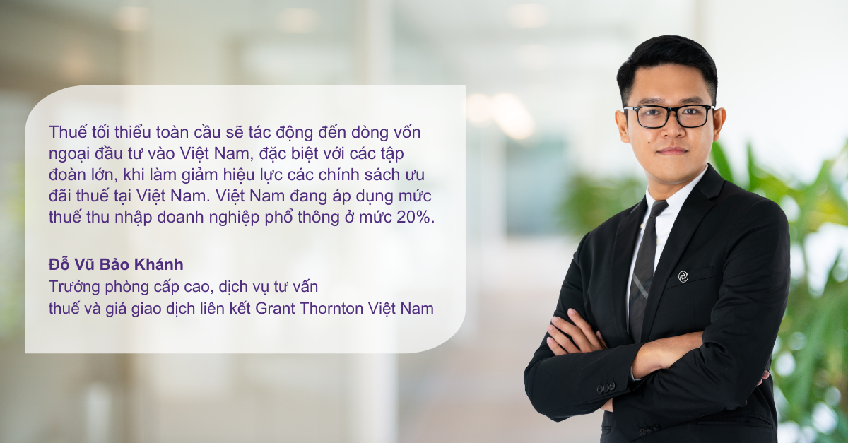 Thuế tối thiểu toàn cầu sẽ tác động đến dòng vốn ngoại đầu tư vào Việt Nam, đặc biệt với các tập đoàn lớn, khi làm giảm hiệu lực các chính sách ưu đãi thuế tại Việt Nam. Việt Nam đang áp dụng mức thuế thu nhập doanh nghiệp phổ thông ở mức 20%.
